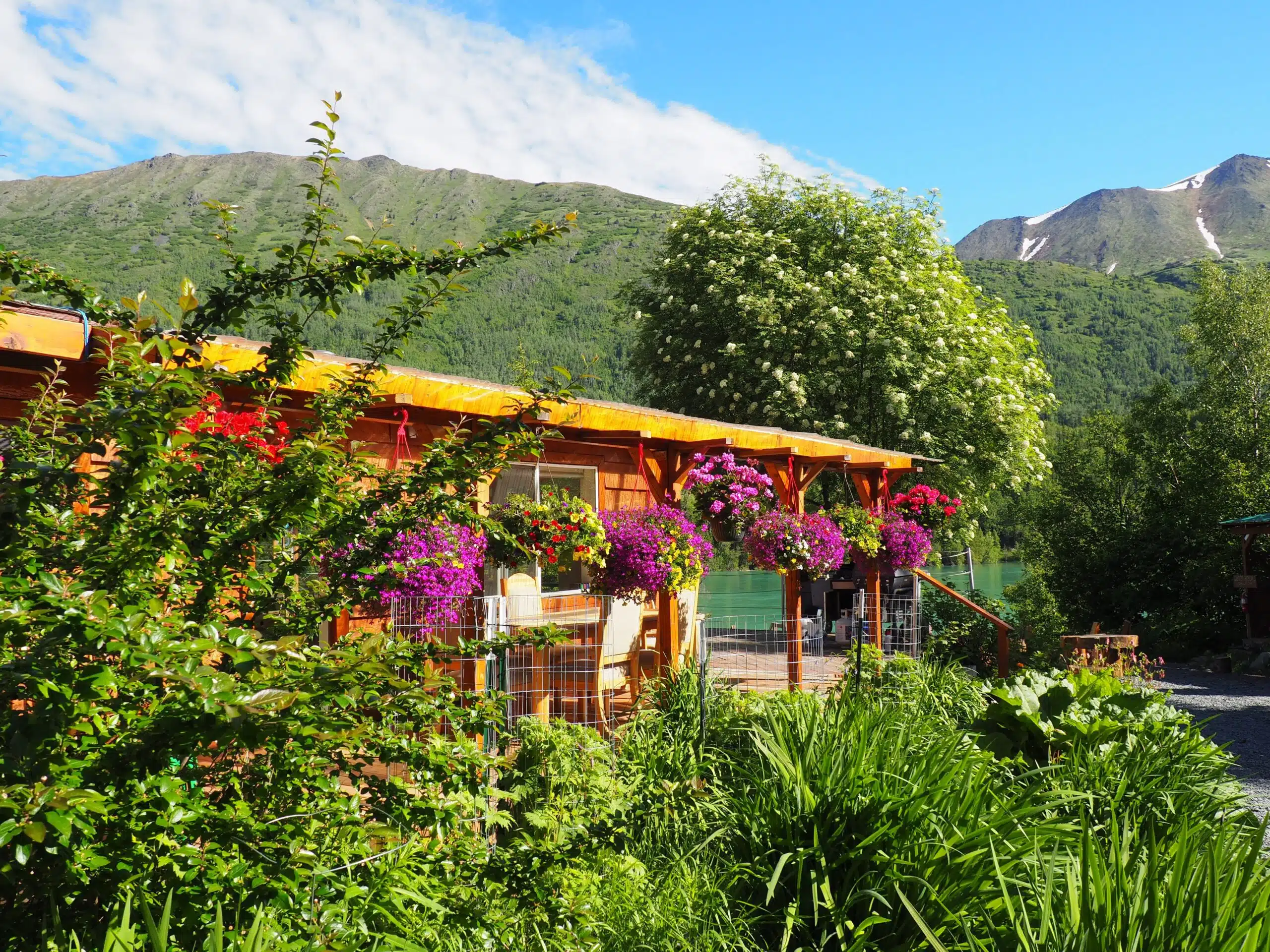 Our property lies between the Sterling Highway and Kenai River, gently sloping down to the river and featuring stunning scenery in every direction. To the north, we have views of Slaughter Ridge and Langille Mountain while Cecil Rhodes Mountain watches over us from the south. The river is a classic, stunning, glacial blue color that flows past our dock, constantly changing throughout the season in water level and rate. Lodging accommodations include 6 private cabins, our Eagle’s Nest apartment and a 5 bedroom, 3 bath River House. Our Swedish sauna features a stunning picture window overlooking the Kenai, along with a communal, riverside fire pit that is enjoyed each evening. Marshmallows included!