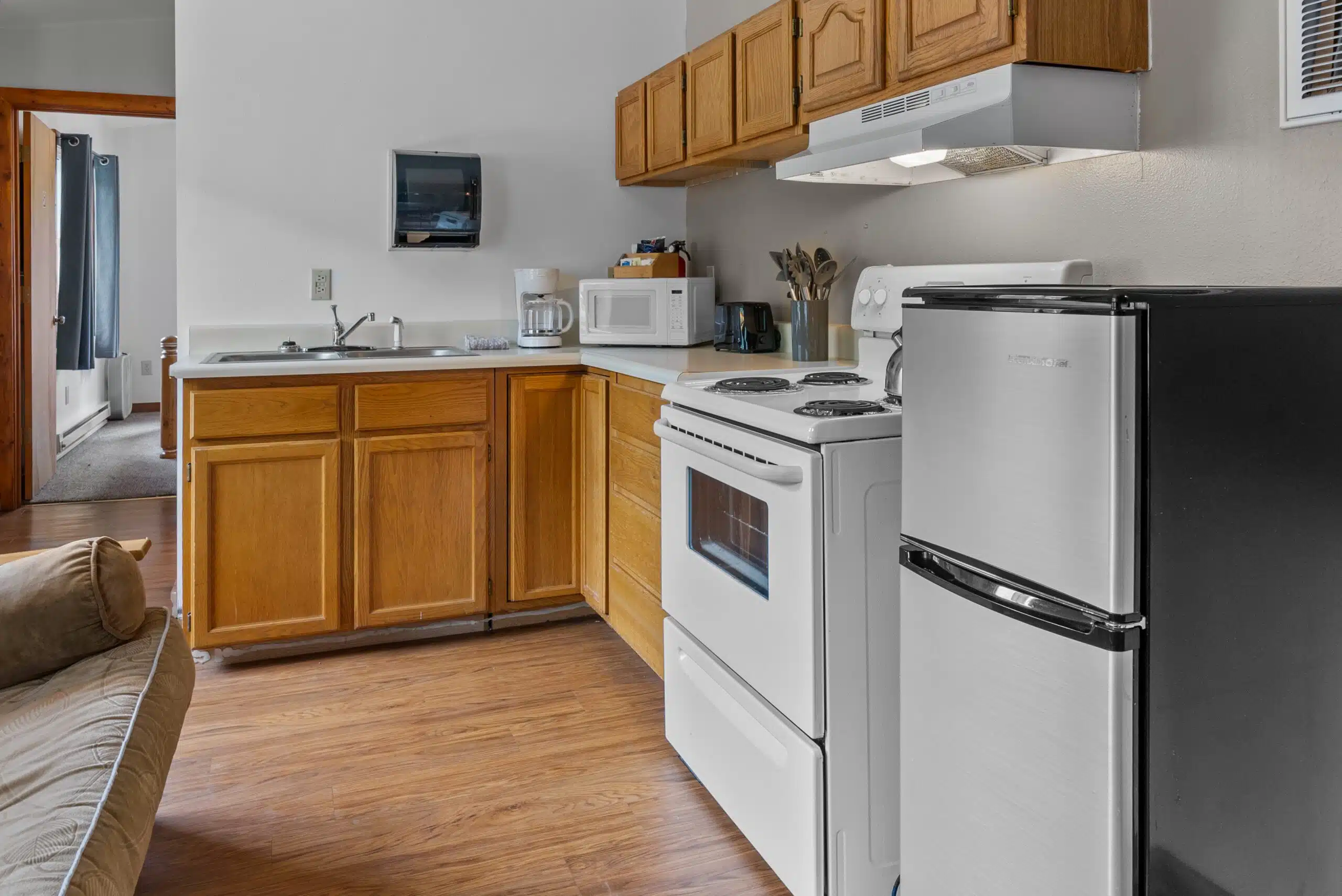The Eagle’s Nest is an efficient apartment located above our main office. There is a private bedroom with 1 queen bed. A door separates this room from the rest of the apartment, which has a full bathroom plus combined kitchen area/living room with a set of bunked beds and a futon that can fold out to a full sized bed. The kitchen has a small fridge, stove, oven, sink, microwave and coffee maker. You will be able to hear some noise from below throughout the day and in the evening from our employees at dinner time.