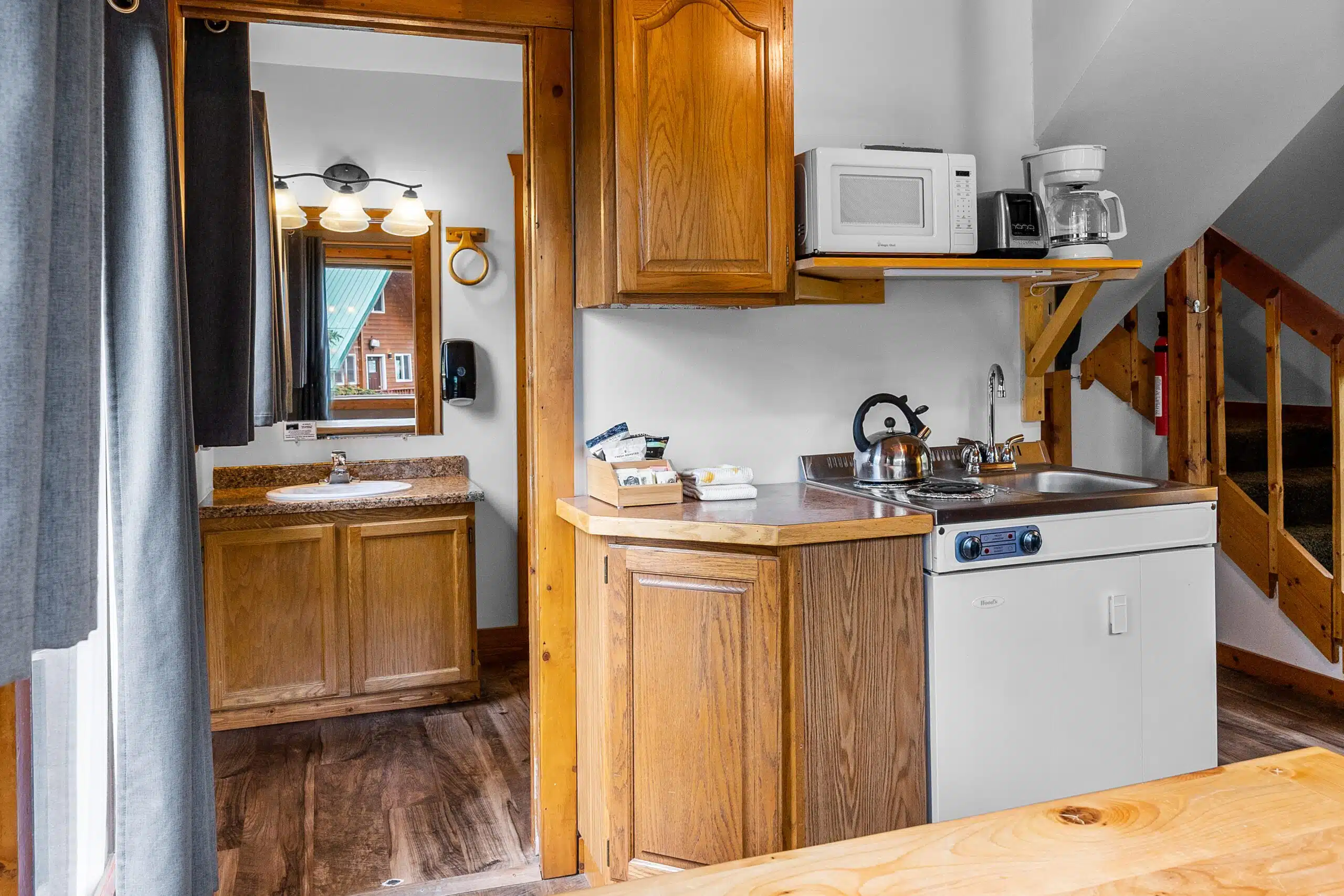 - Kitchenette with 2-burner stove, sink, mini-fridge