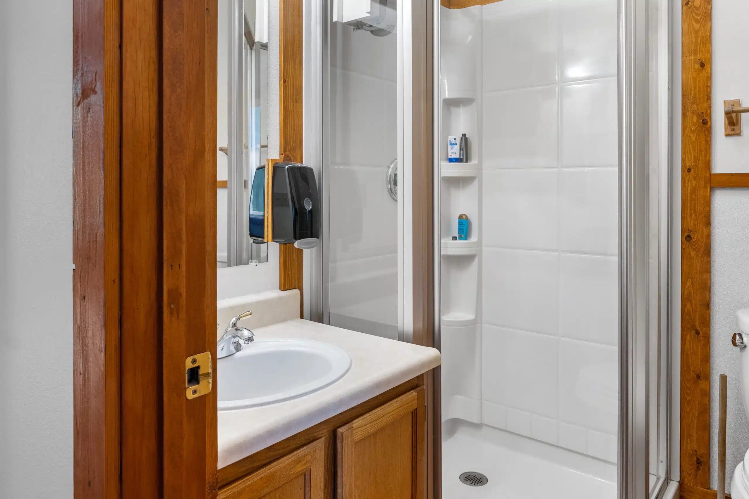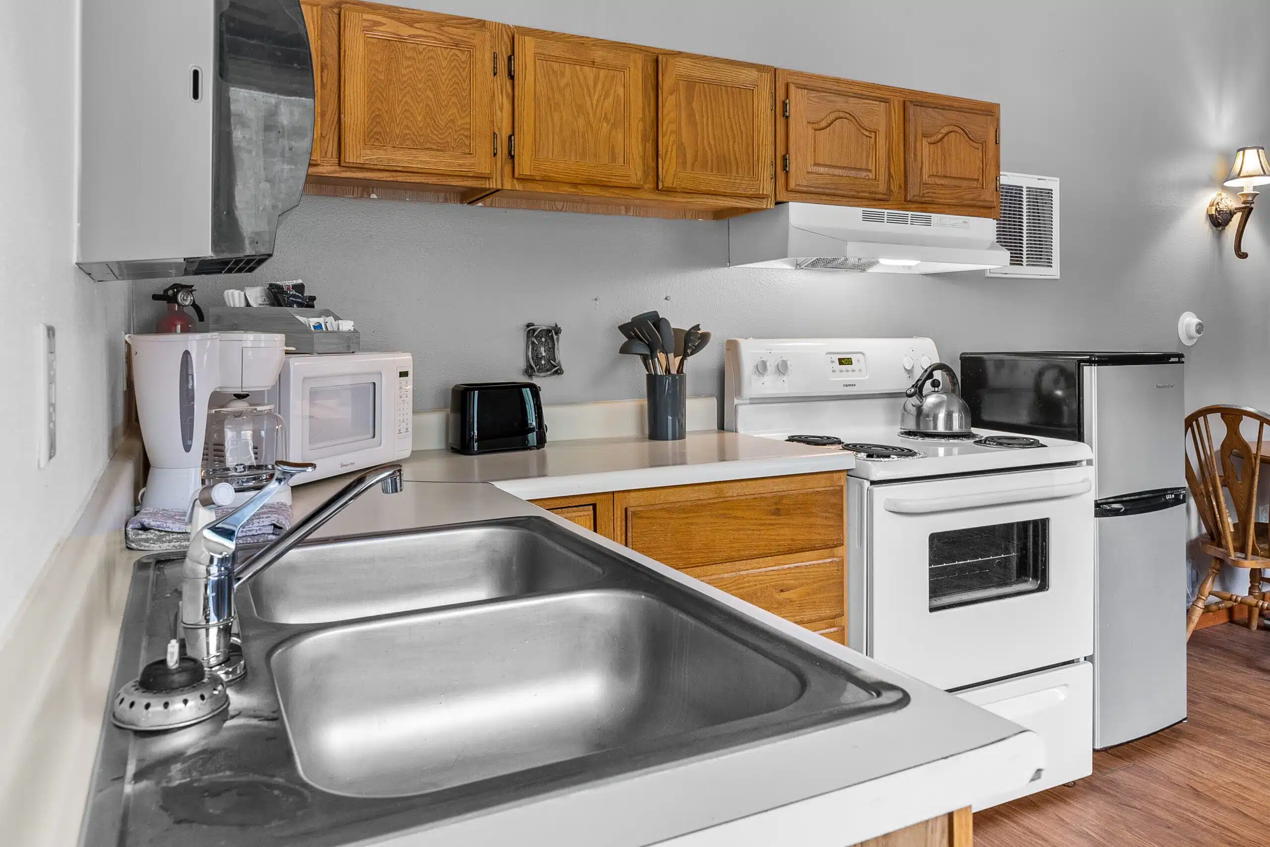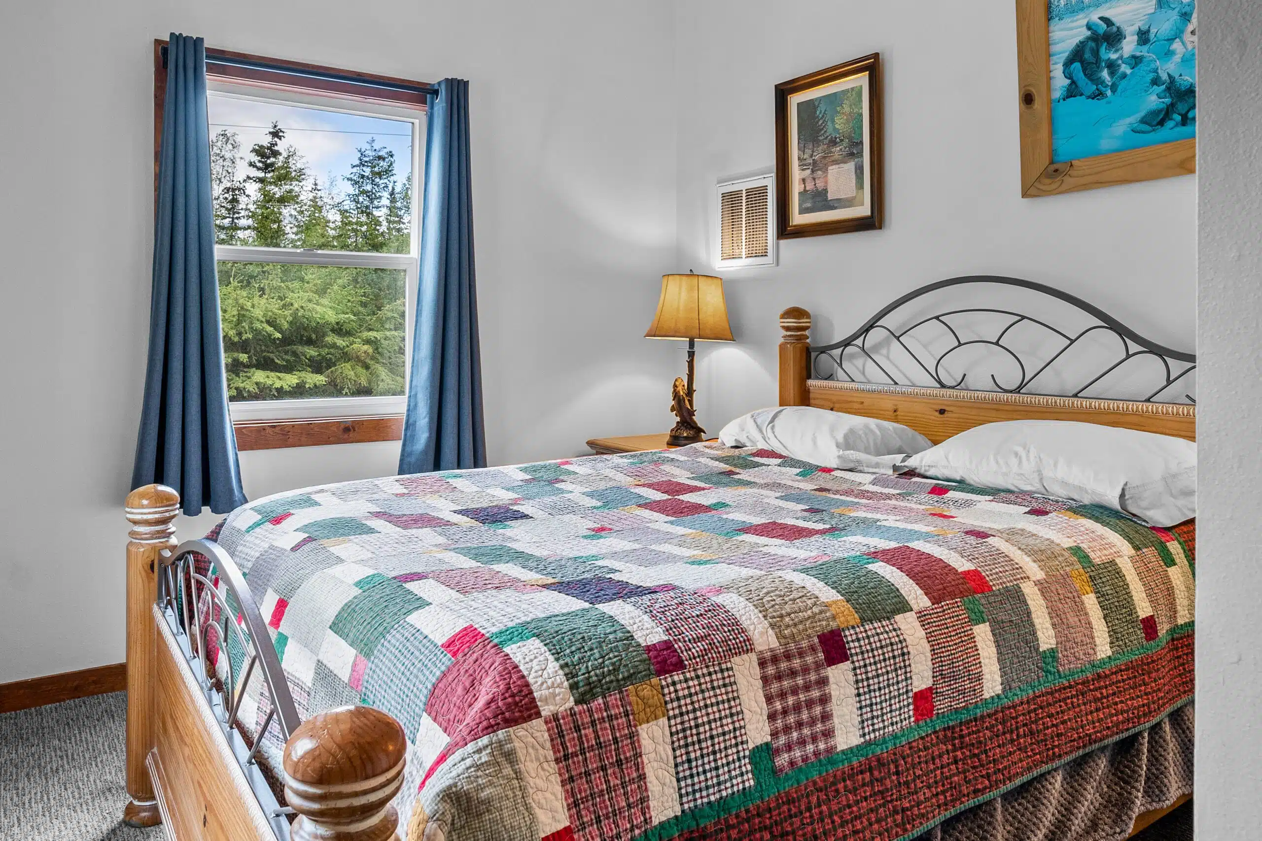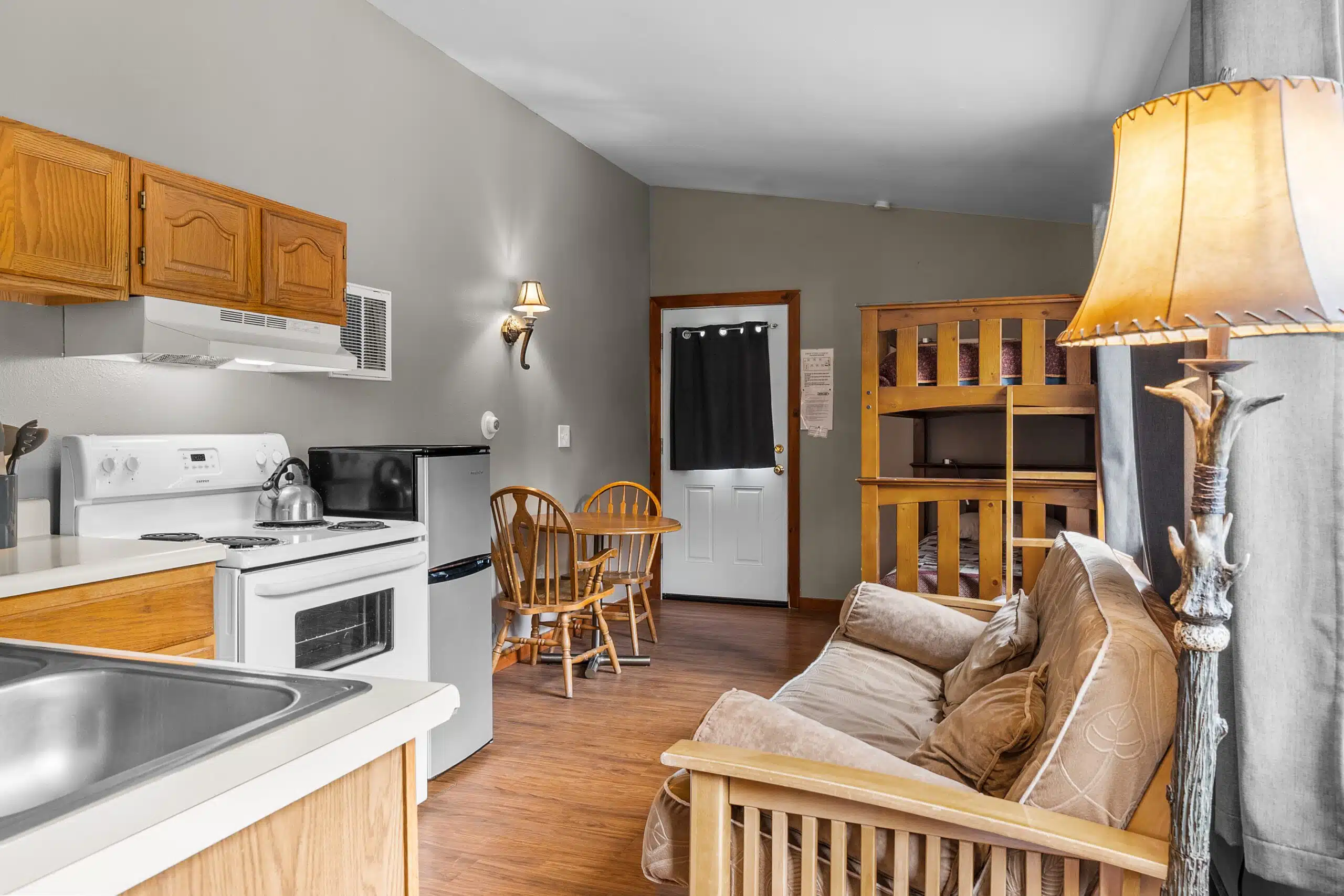 The Eagle’s Nest is an efficient apartment located above our main office. There is a private bedroom with 1 queen bed. A door separates this room from the rest of the apartment, which has a full bathroom plus combined kitchen area/living room with a set of bunked beds and a futon that can fold out to a full sized bed. The kitchen has a small fridge, stove, oven, sink, microwave and coffee maker. You will be able to hear some noise from below throughout the day and in the evening from our employees at dinner time.